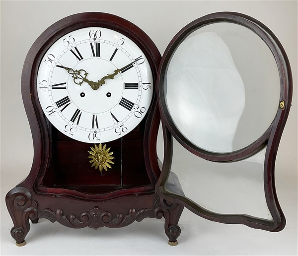 Orologio con cassa di forma mossa in legno intagliato a volute. Quadrante in sm