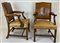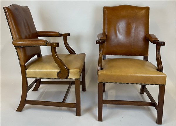 Coppia di poltrone in mogano con braccioli mossi e gambe posteriori a sciabola, rivestimento in pelle borchiata (difetti)
