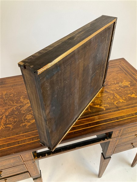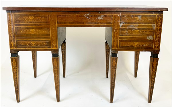 Scrivania da centro lastronata in palissandro, bois de rose e bois de violette, filetatta e intarsiata in legni vari, sul fronte a volute fogliate e candelabra, sui fianchi a fonte della vita, il piano a scena galante entro medaglione tra girali di foglie e fiori. Sette tiretti sul fronte, gambe ad obelisco rovesciato. Secolo XIX (cm 121x79x61) (difetti)