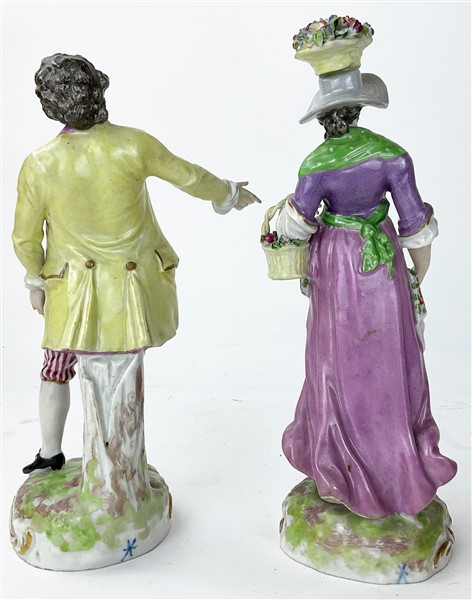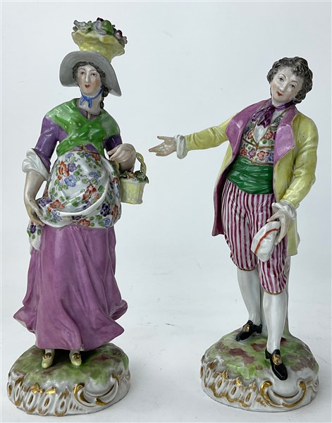 Manifattura del secolo XX. Coppia di figure in porcellana policroma profilata i