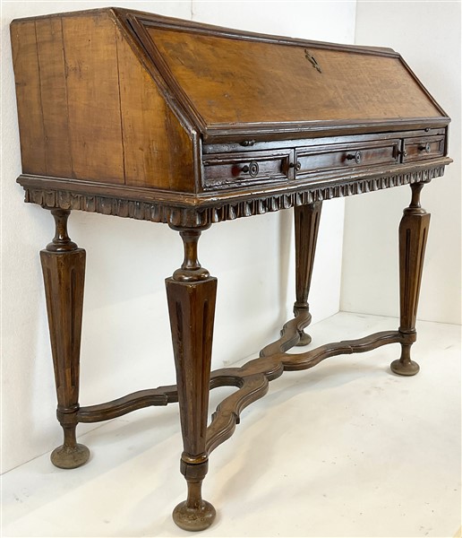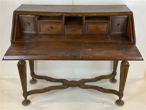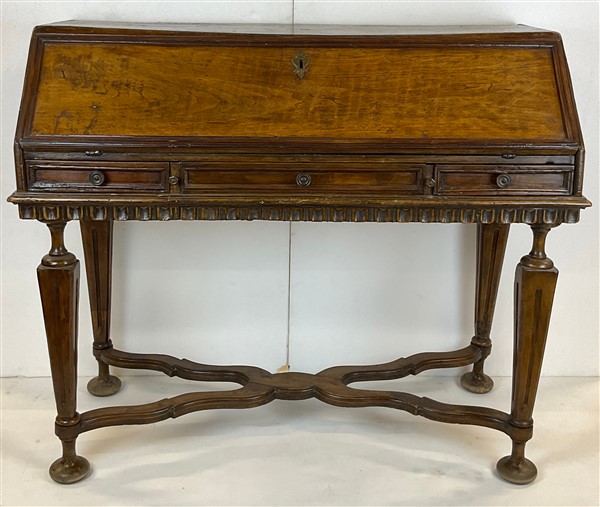 Antico scrittoio in noce ad un'anta ribaltabile pannellata che rivela cinque tiretti, tre cassetti nella fascia con bordo dentellato, gambe rastremate e scanalate riunite da traverse sagomate. (cm 121x106x555) (difetti e restauri)