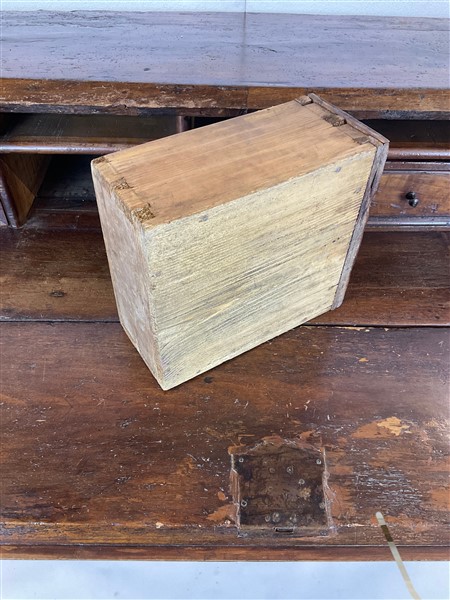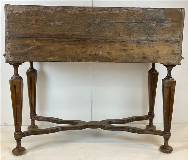 Antico scrittoio in noce ad un'anta ribaltabile pannellata che rivela cinque ti