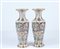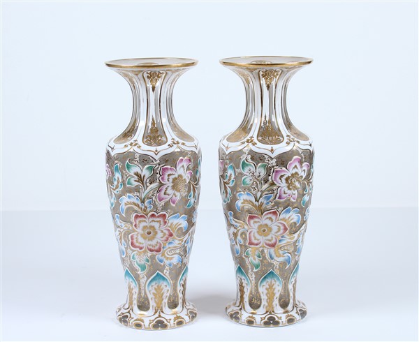 Manifattura boema, secolo XIX. Coppia di vasi in vetro molato con decoro floreale policromo a smalti e dorature (h. cm 33) (lievi difetti)