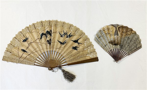 Lotto di due ventagli con stecche in legno pagine in tessuto e pizzo dipinto raffiguranti volatili, di cui uno firmato e decorato da paillettes (difetti)