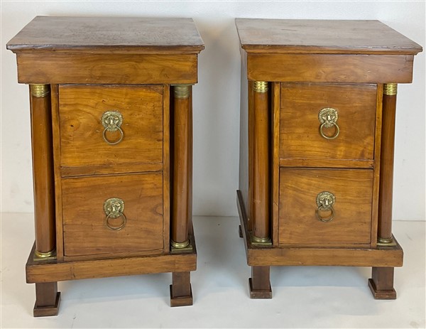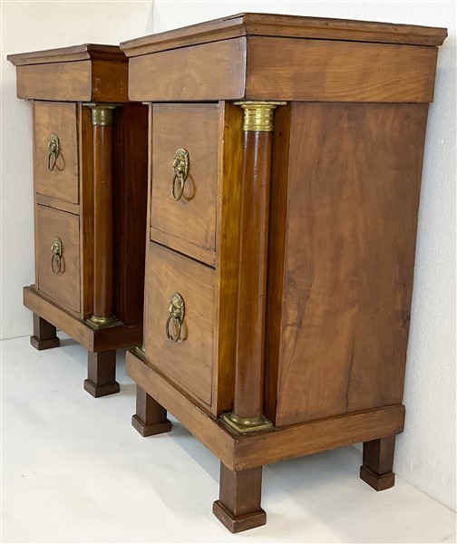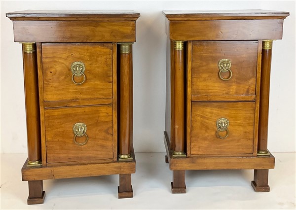 Coppia di comodini Impero in noce a due cassetti grandi e uno piccolo sottopiano, colonne laterali e guarnizioni in bronzo dorato, piedi a plinto (cm 49x80x36,5) (difetti e restauri)