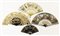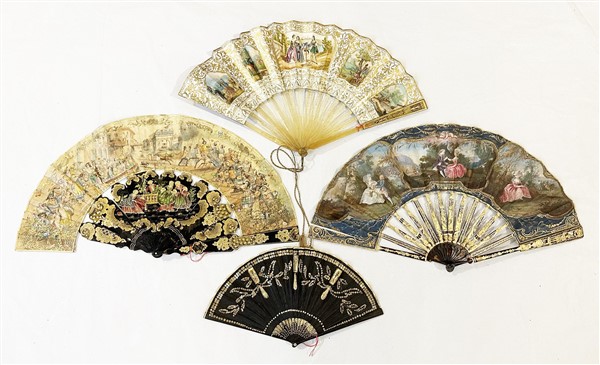 Lotto di quattro ventagli con stecche in legno e bachelite traforata, dorati e argentati con pagine in carta applicata su tessuto e carta. Dipinti a scene galanti e di corte. Uno con pailettes (difetti e rotture)