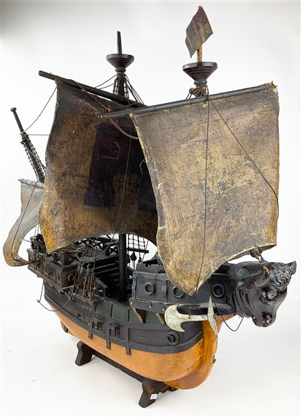 Modello di veliero in legno intagliato e in parte dipinto con vele in cuoio (l. cm 84) (difetti)