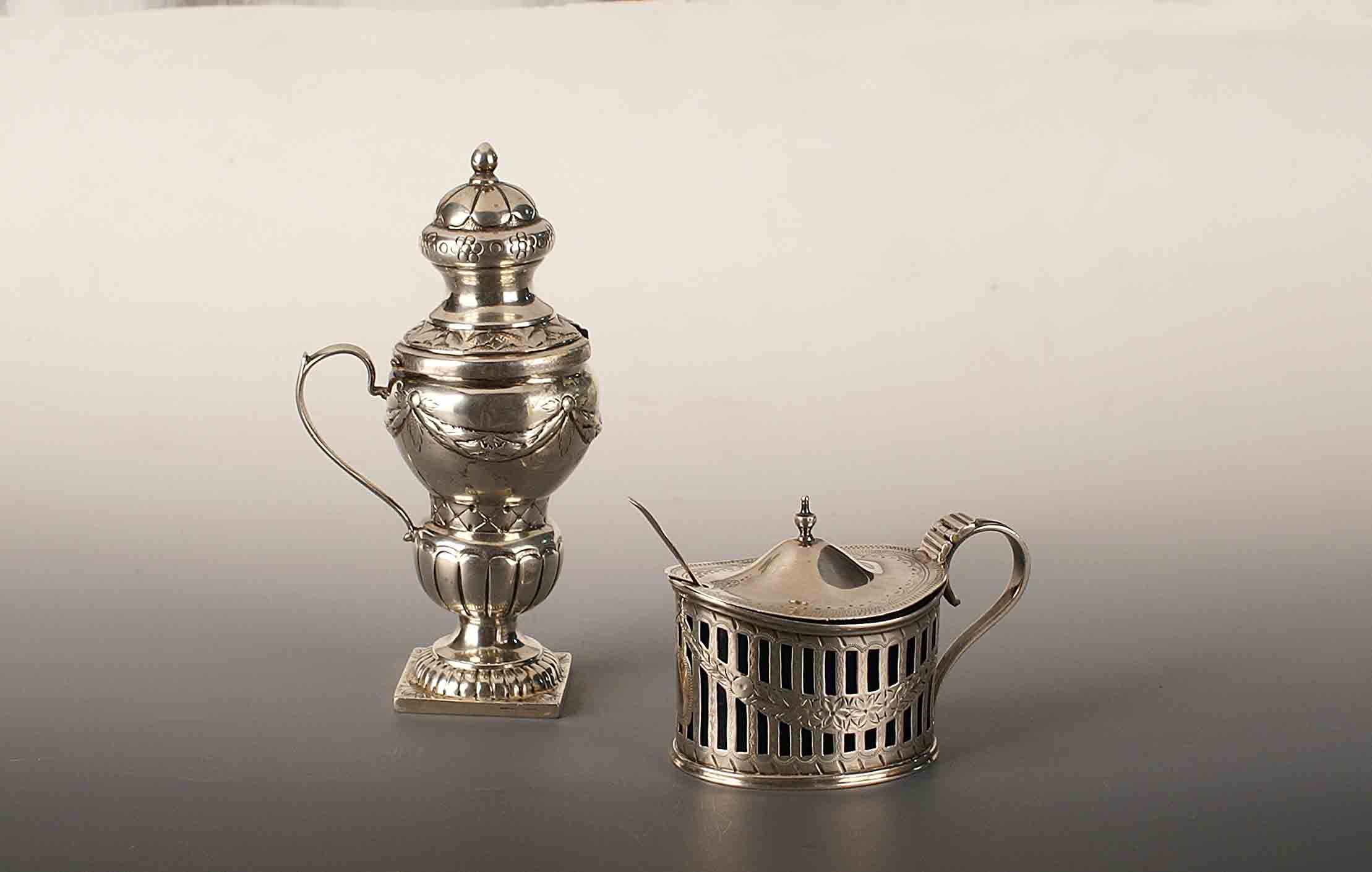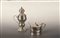 Lotto composto da una salierina e una mostardiera in argento con interni in opalina, fogge e manifattture diverse.