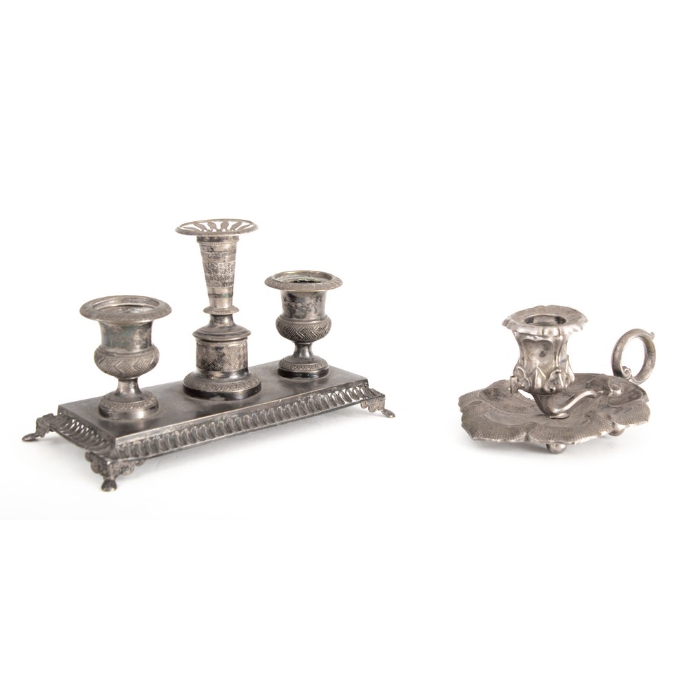 CALAMAIERA Luigi XVI in argento cesellato e traforato e bugia del XIX secolo in argento sbalzato (usure).