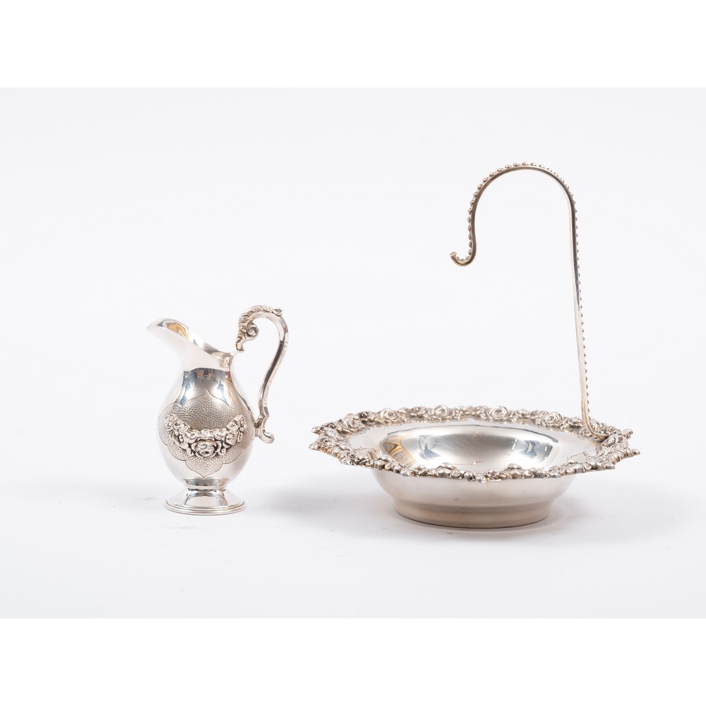 Piccola caraffa con ciotolina in argento 925 sbalzato a motivo floreale e fogliaceo (g. 240).