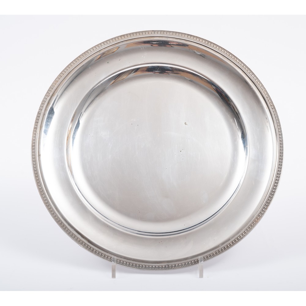 VASSOIO tondo stile Impero in argento con bordo lavorato. Argentiere Ricci & C. - Alessandria (g. 710).