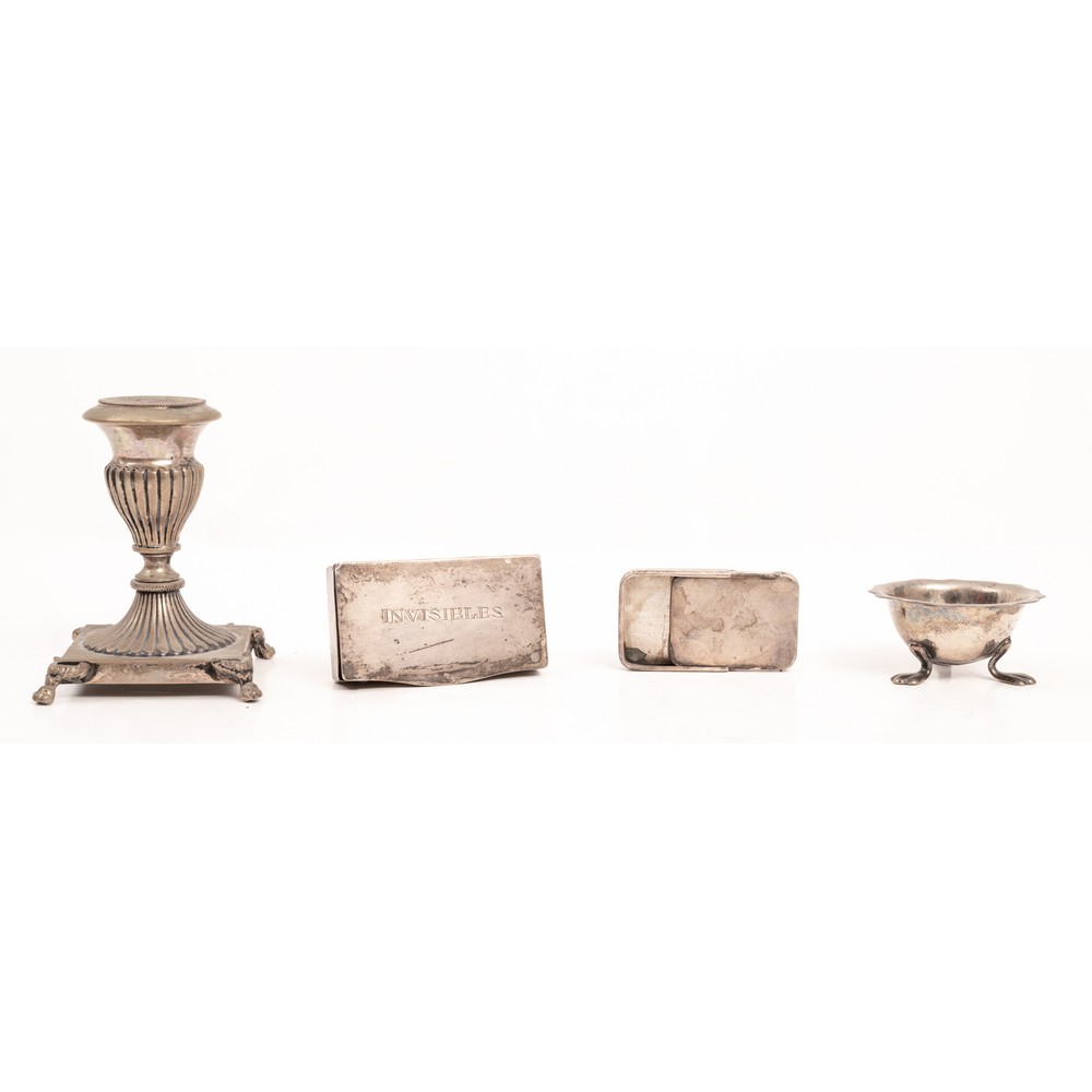 Monocera stile Impero in argento, tabacchiera in argento 925 firmata Ortega Mexico, porta cerini in argento sterling con monogramma A.C. (gr. 177) e saliera in metallo (usure).