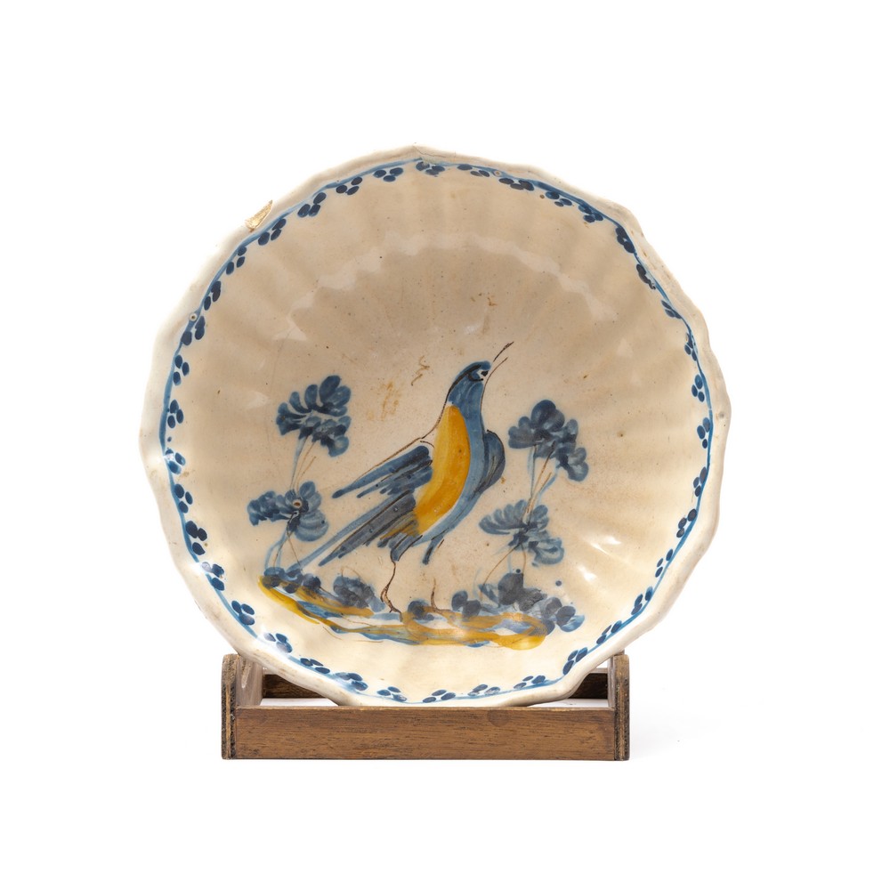 Centrotavola in maiolica policroma decorato con volatile (usure e piccoli restauri).