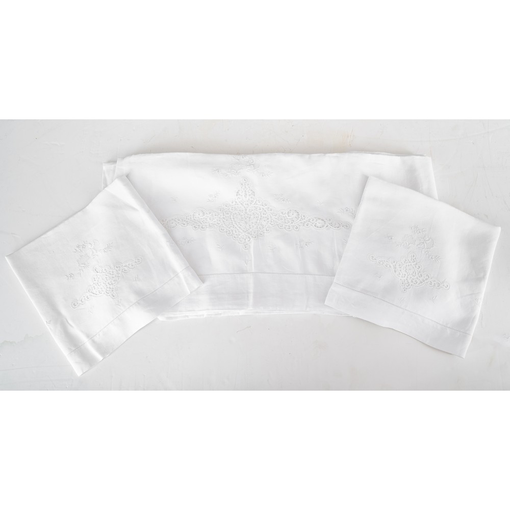 LENZUOLO MATRIMONIALE di lino con ricami a mano e due federe nei toni del bianco.
