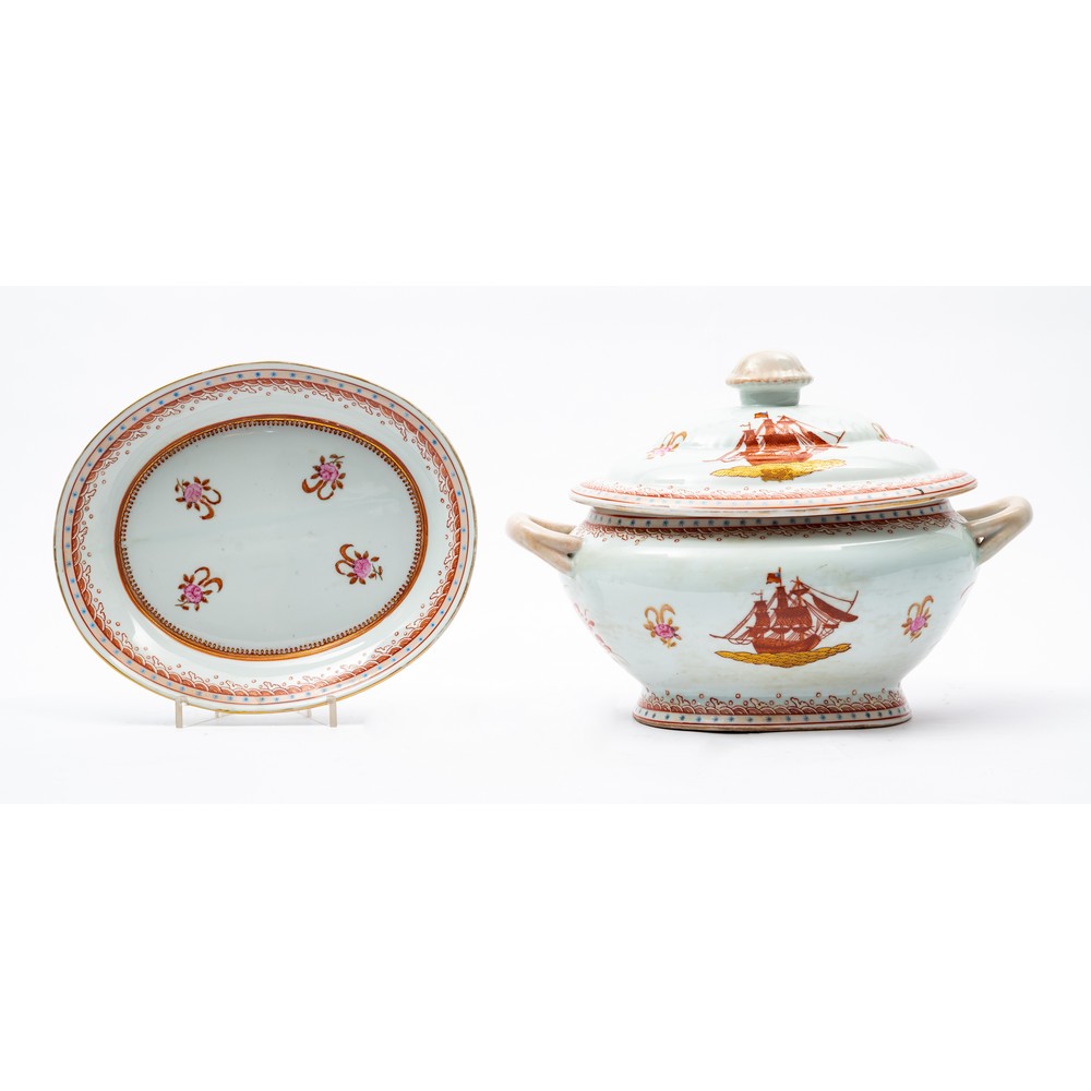 Zuppiera con piatto in porcellana policroma decorata con motivi di velieri (usure).