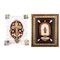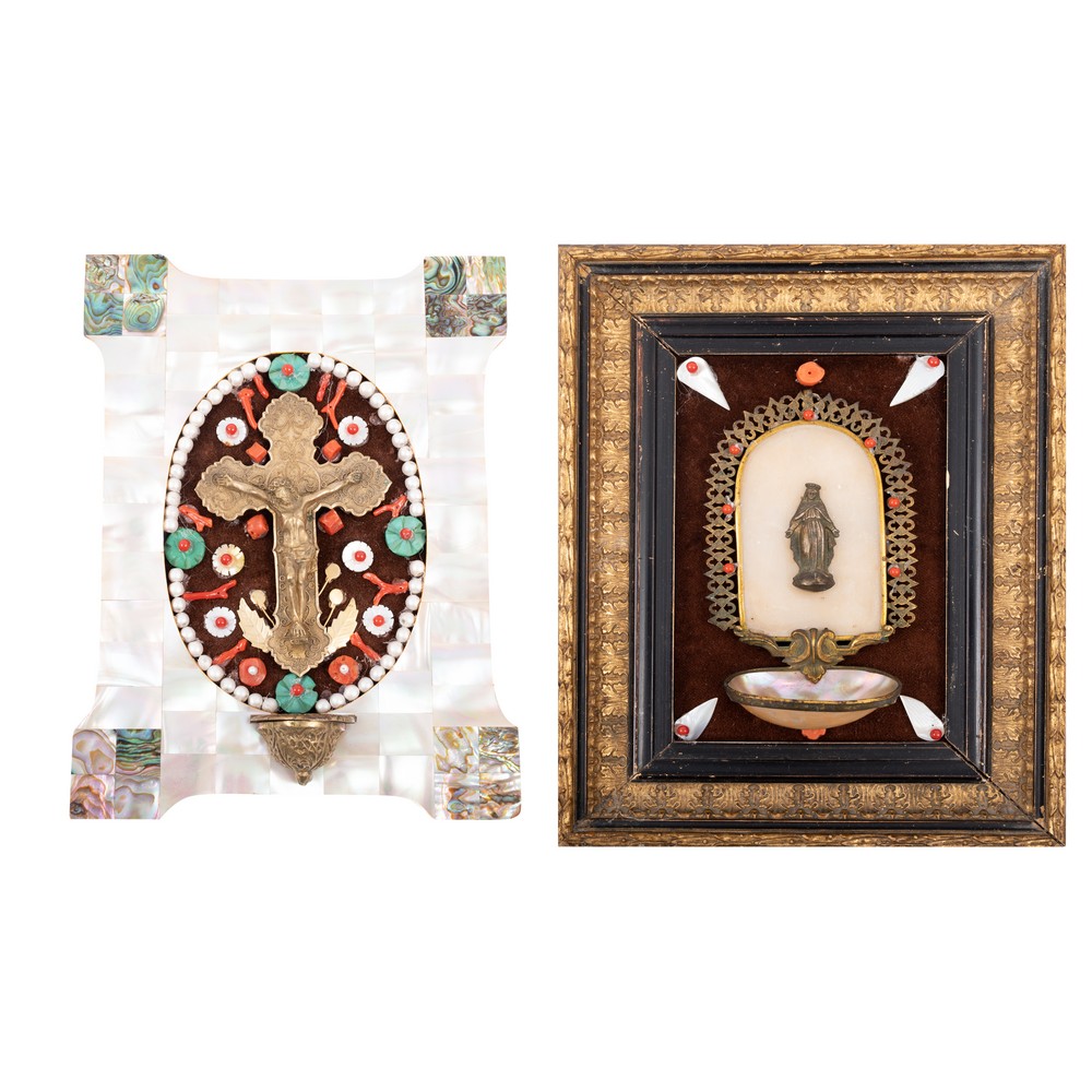DUE ACQUASANTIERE in metallo, madreperla e corallo .