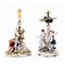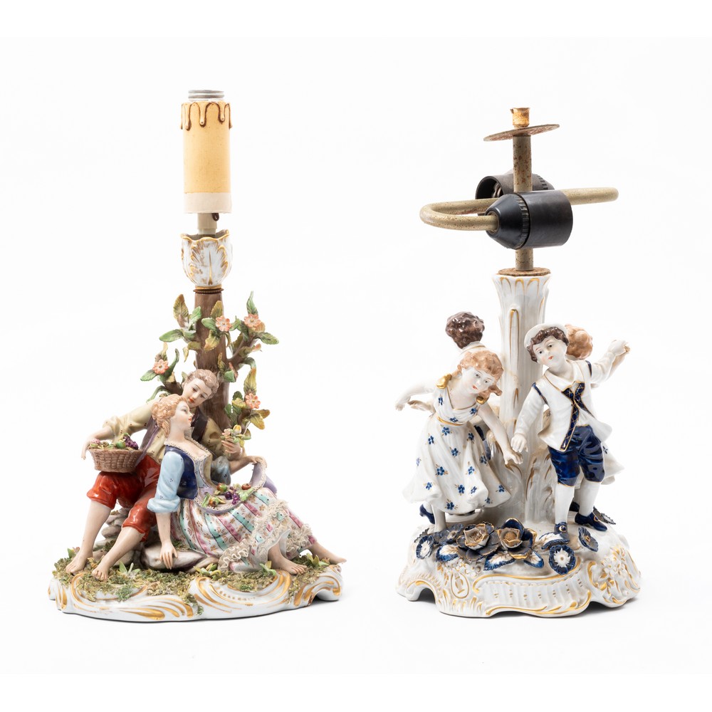 Lume a due luci in porcellana bianca capodimonte raffigurante "Fanciulli", lumeggiature in oro. Lume a una luce in porcellana bianca capodimonte raffigurante "Figure", lumeggiature in oro (usure, rotture).