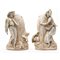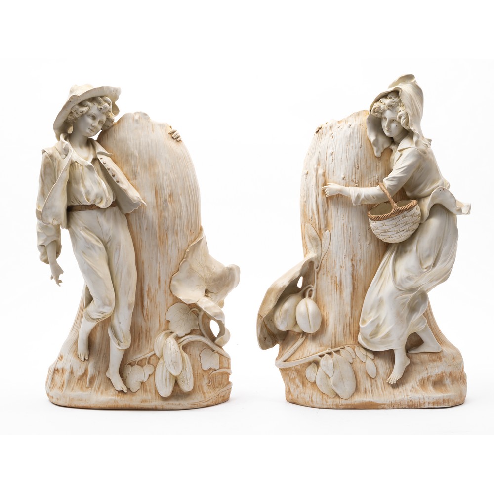 Coppia di vasi periodo Liberty in biscuit con sculture raffiguranti "Due figure" (usure e restauro).