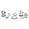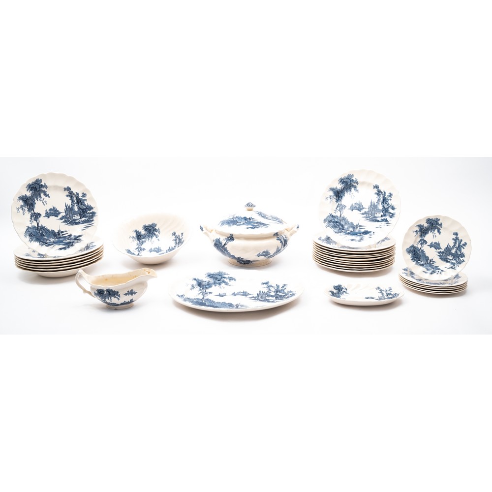 Servizio di piatti in porcellana bianca con decori a motivo paesaggistico nei toni del blu composto da: zuppiera, insalatiera, salsiera, raviera, piatto da portata ovale, 6 piatti fondi, 12 piatti piani e 6 piattini frutta.