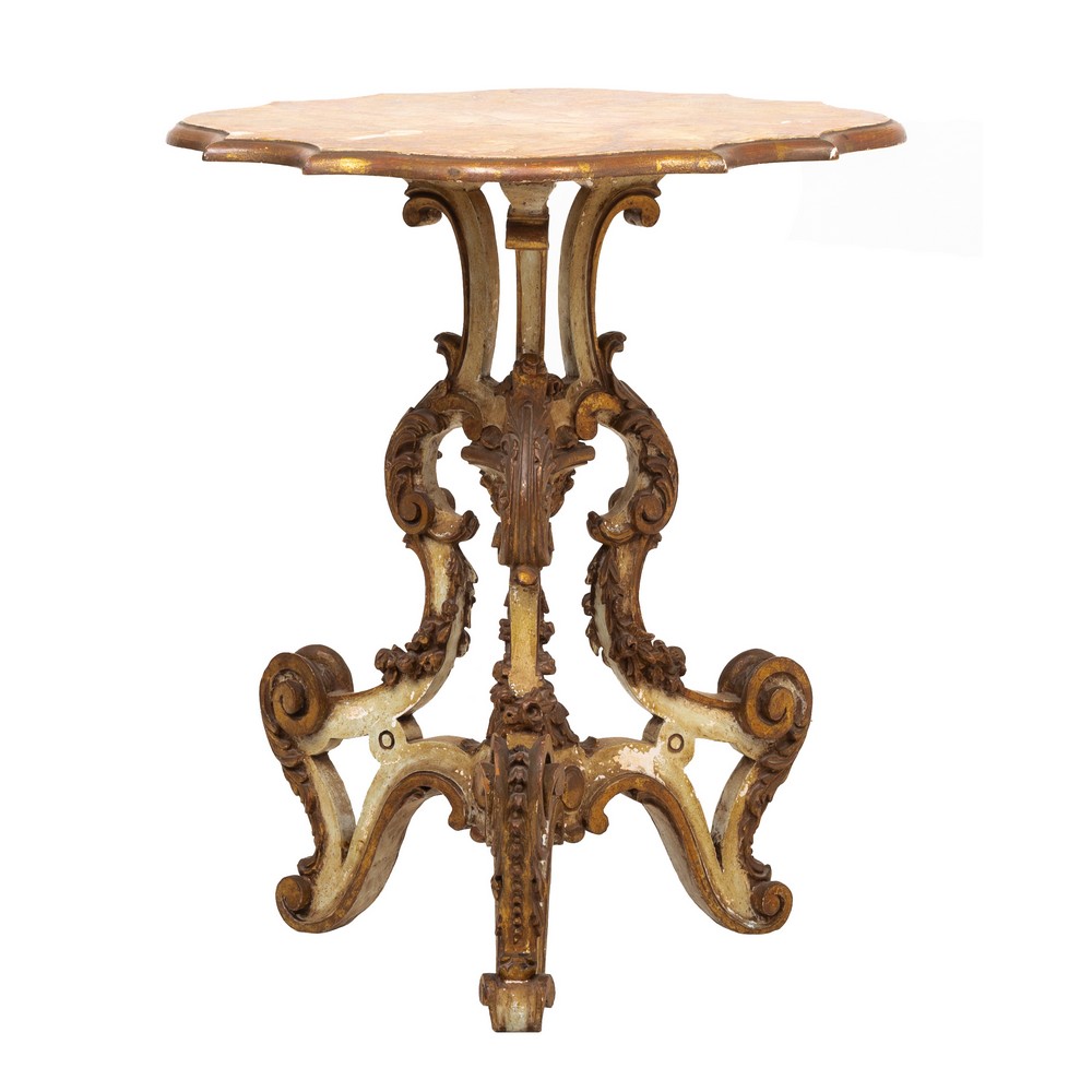 Tavolino di gusto Barocco in legno laccato e dorato con piano decorato a finto marmo.