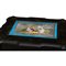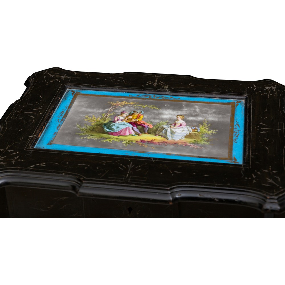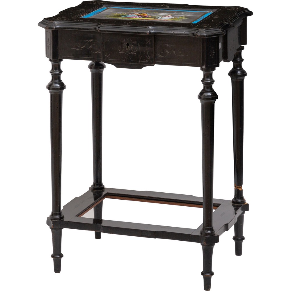 TAVOLINO da lavoro in legno ebanizzato, con placca in porcellana sul piano.