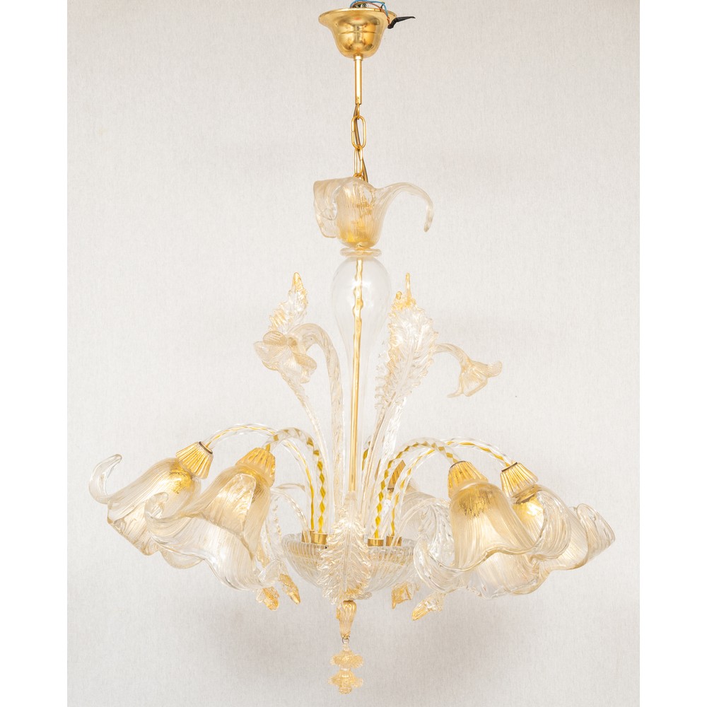 LAMPADARIO in vetro di murano a cinque luci nei toni del bianco e dell'oro.