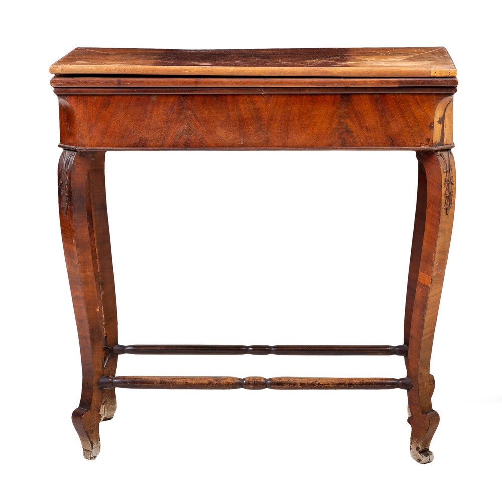 Tavolo da gioco con apertura a libro in mogano e piuma di mogano, con cassetto laterale.