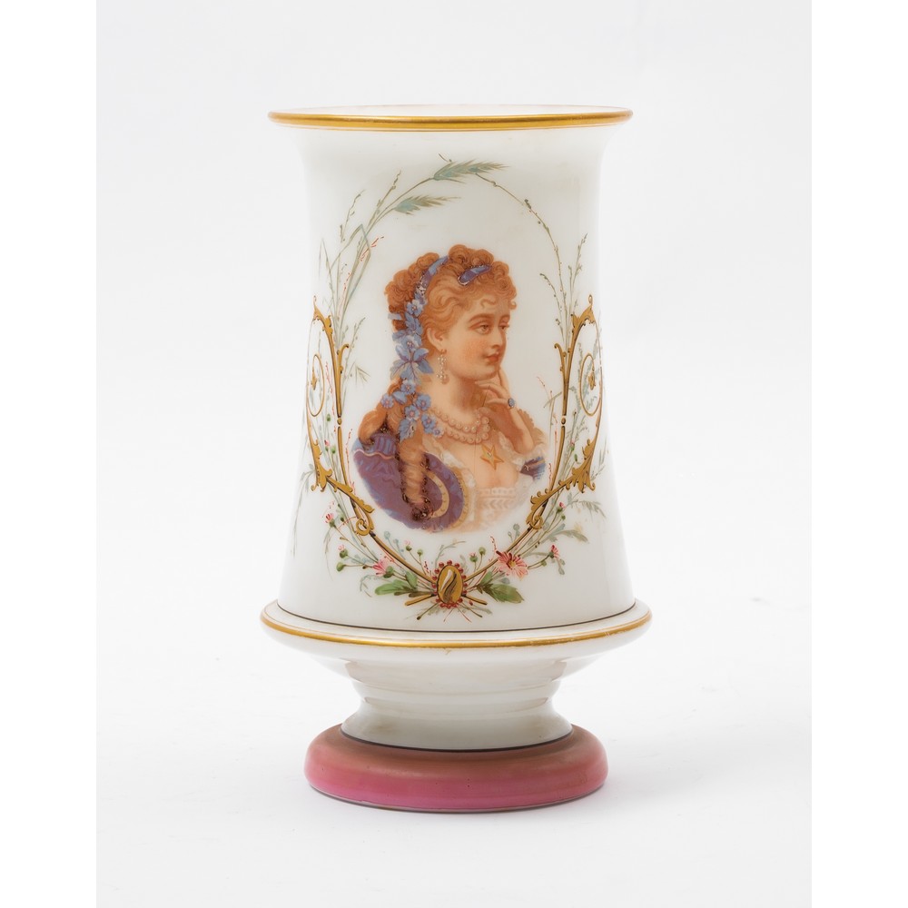 Vaso in opaline nei toni del bianco e del rosa con lumeggiature in oro e dipinto a mano raffigurante "Figura femminile".