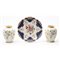 Coppia di potiche e piatto in porcellana bianca con decori a motivo floreale.