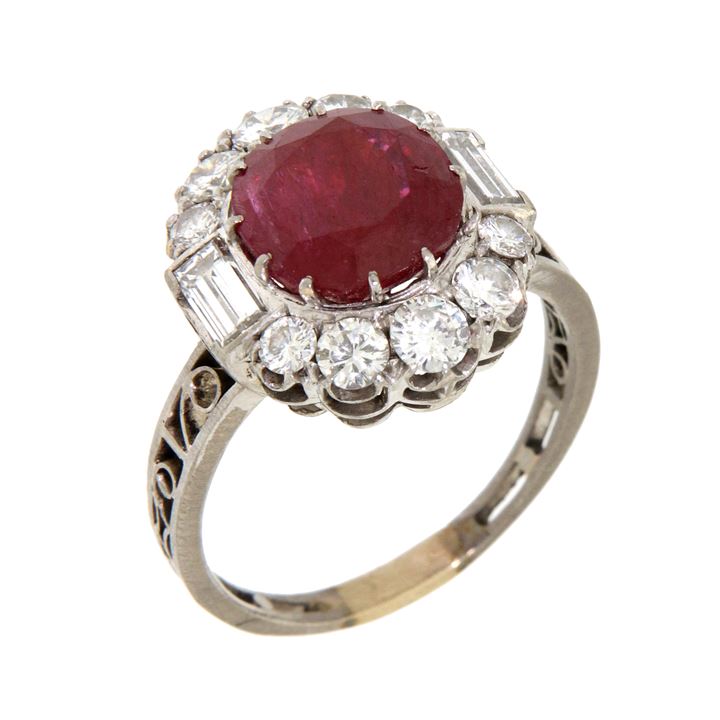 con rubino centrale (piccola scheggiatura) di ct 4 ca, contornato da dieci brillanti rotondi per complessivi ct. 0.95 ca e due brillanti taglio baguette per complessivi ct. 0,40 ca