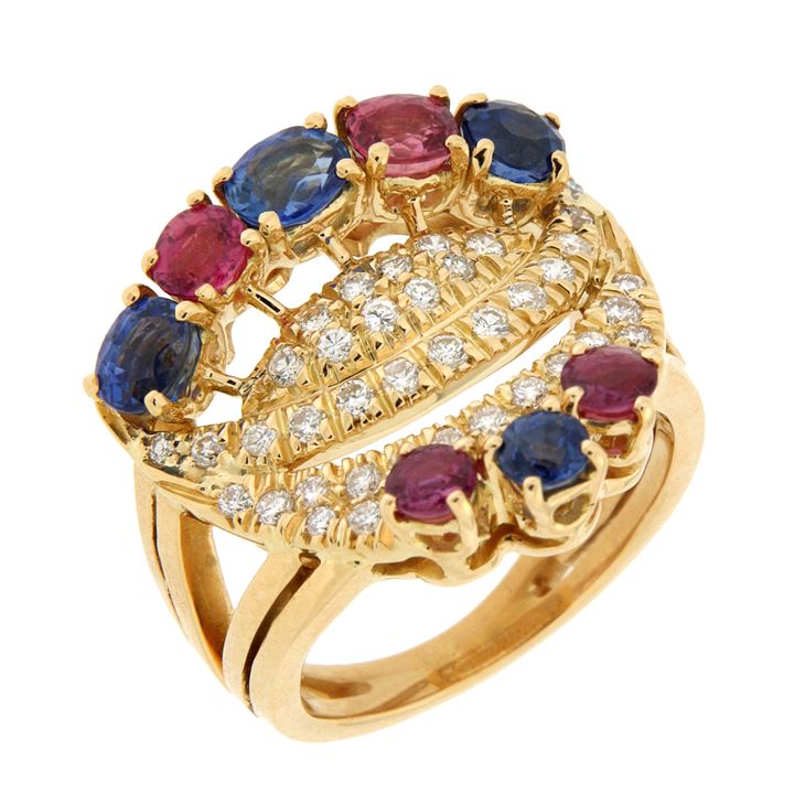 Anello in oro giallo, firmato "Repossi", sommità fantasia con zaffiri e rubini taglio rotondo ed ovale, tre fasce in diamanti taglio brillante per complessivi ct 0,50 ca
