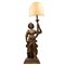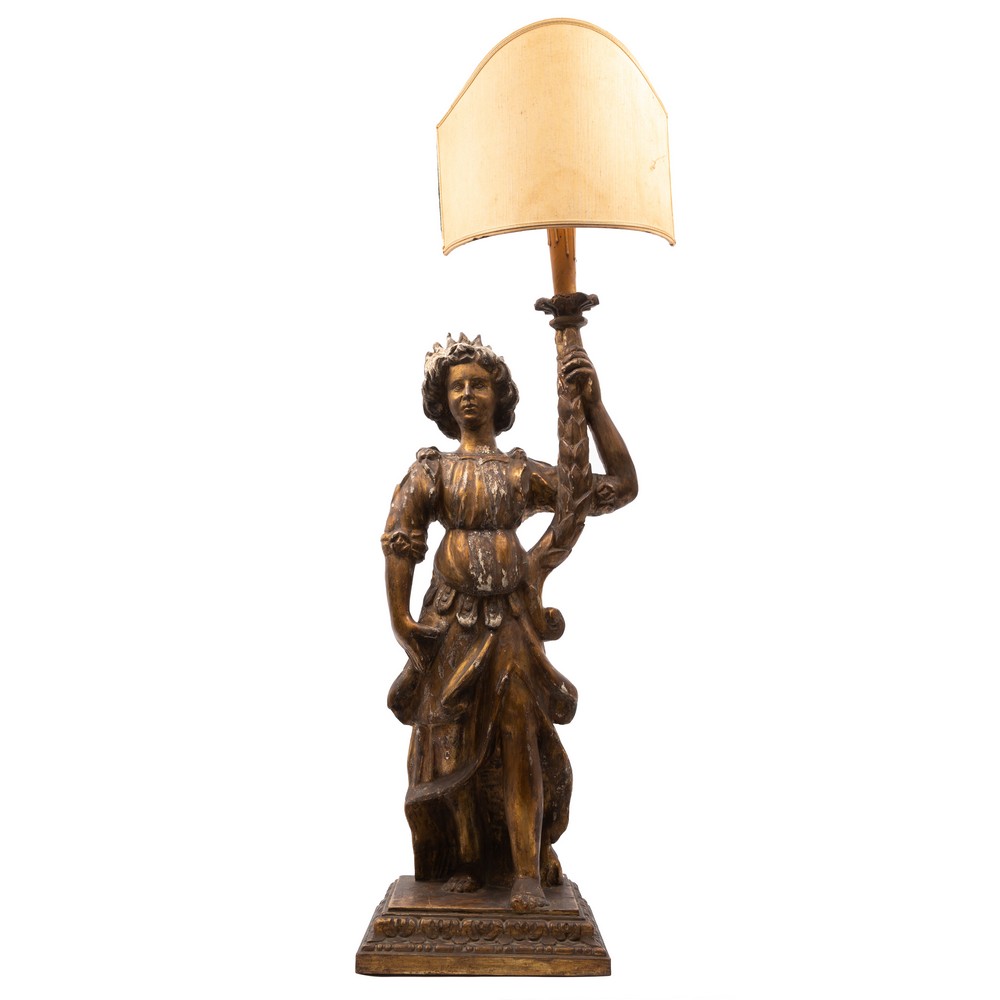 Scultura raffigurante "Figura femminile" a lume in legno dorato ad argento e mistura con paralume in tessuto (elettrificato).