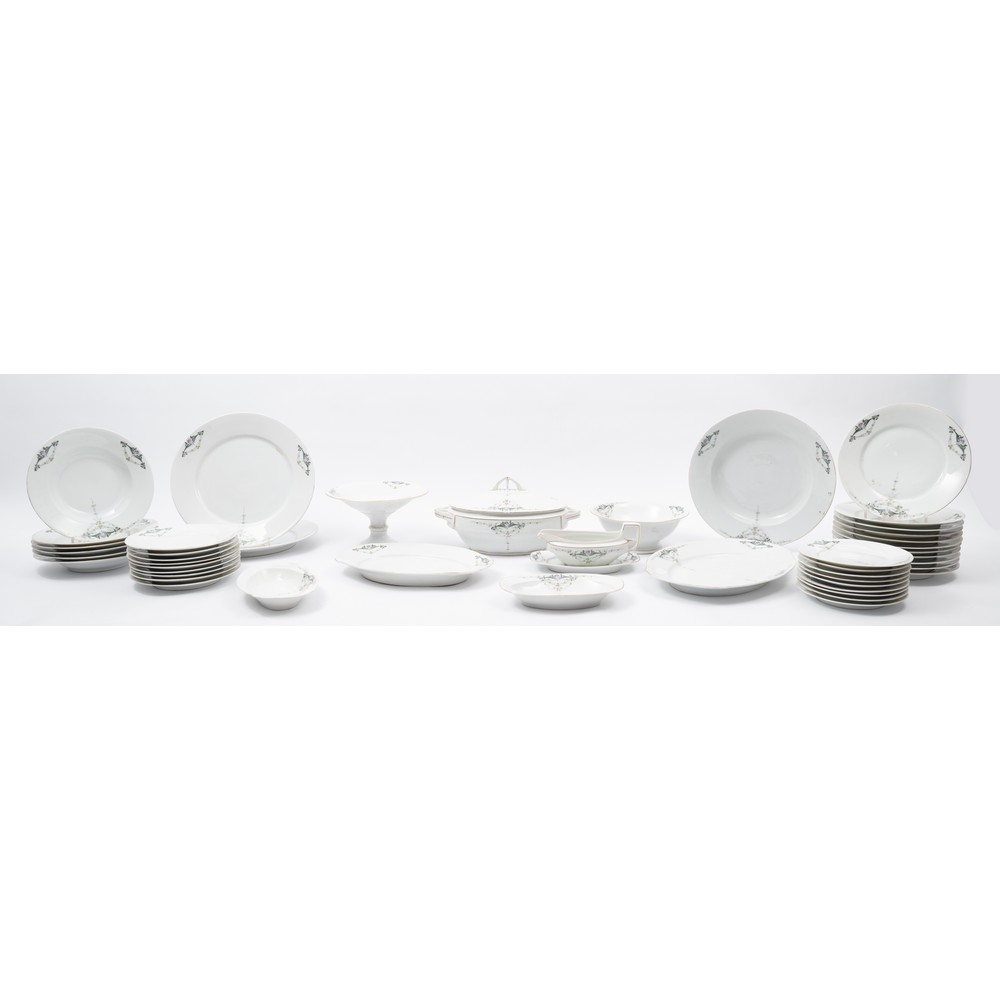 SERVIZIO DI PIATTI in porcellana decorata composto da zuppiera, salsiera, 5 piatti da portata, ciotola, tre salsiere, alzata, sei piatti fondi, undici piatti piani, nove piatti da frutta e da nove piattini da dolce.