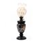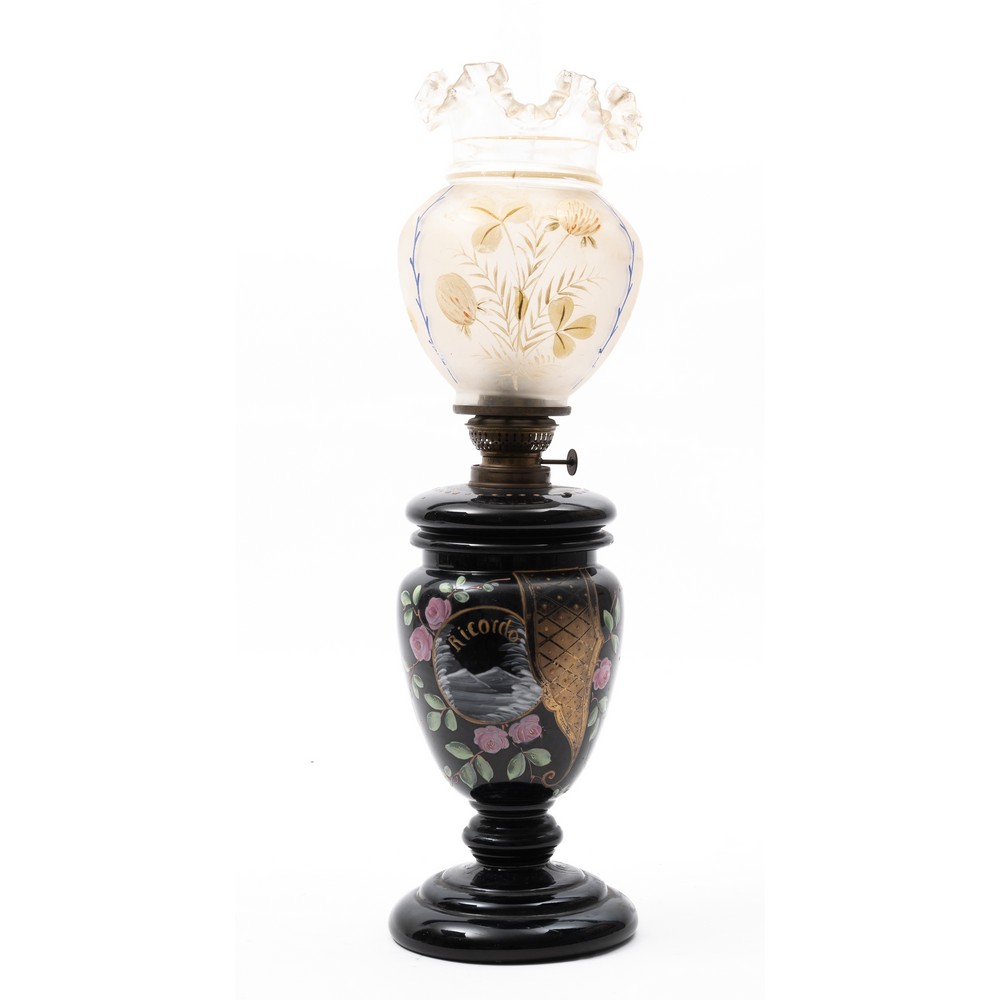Lume a petrolio in opaline nei toni del nero e decorato a motivo floreale e fogliaceo. Boccia in vetro dipinto.
