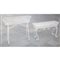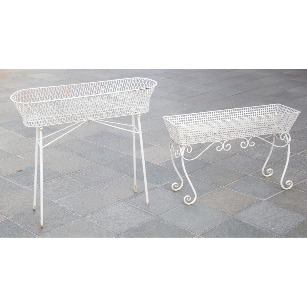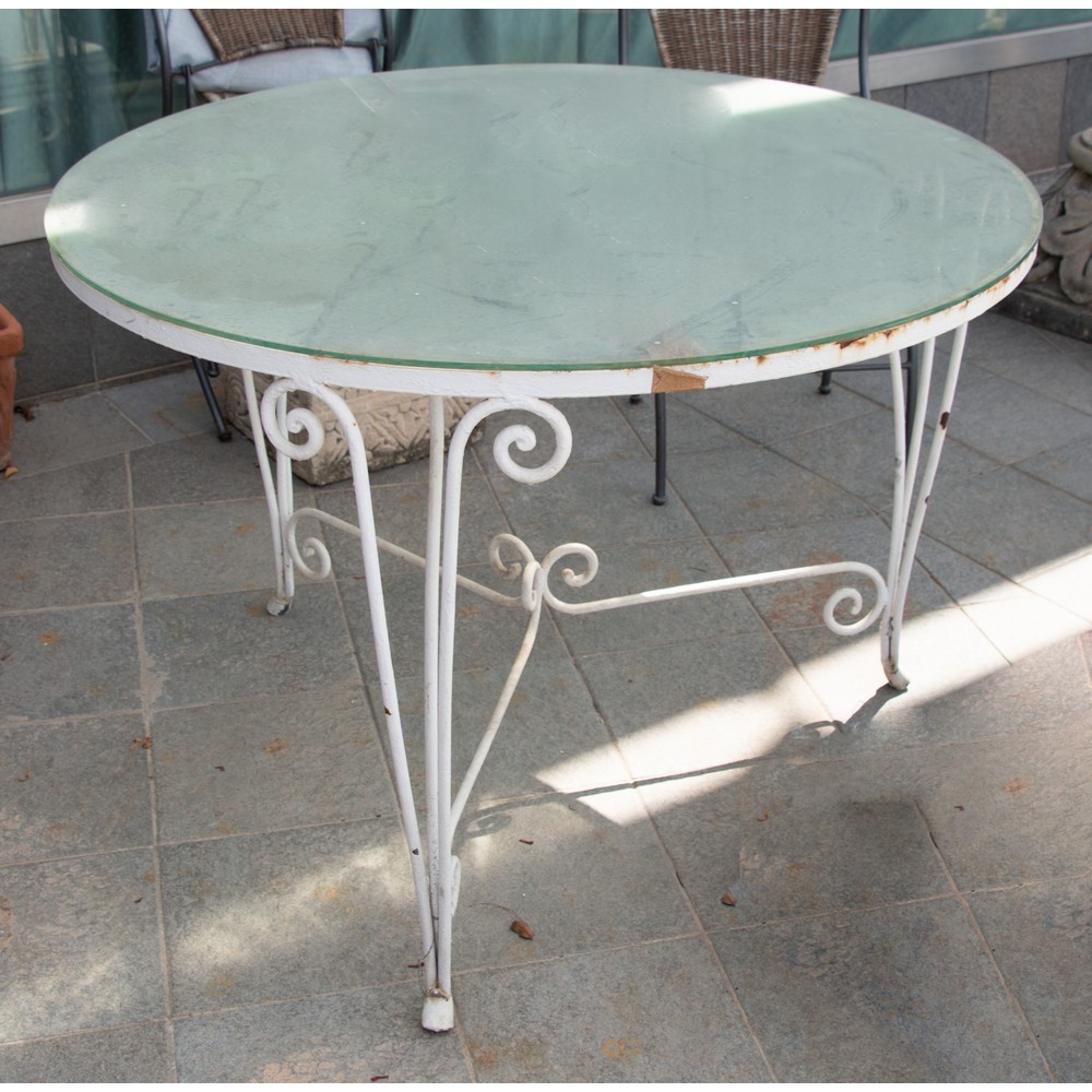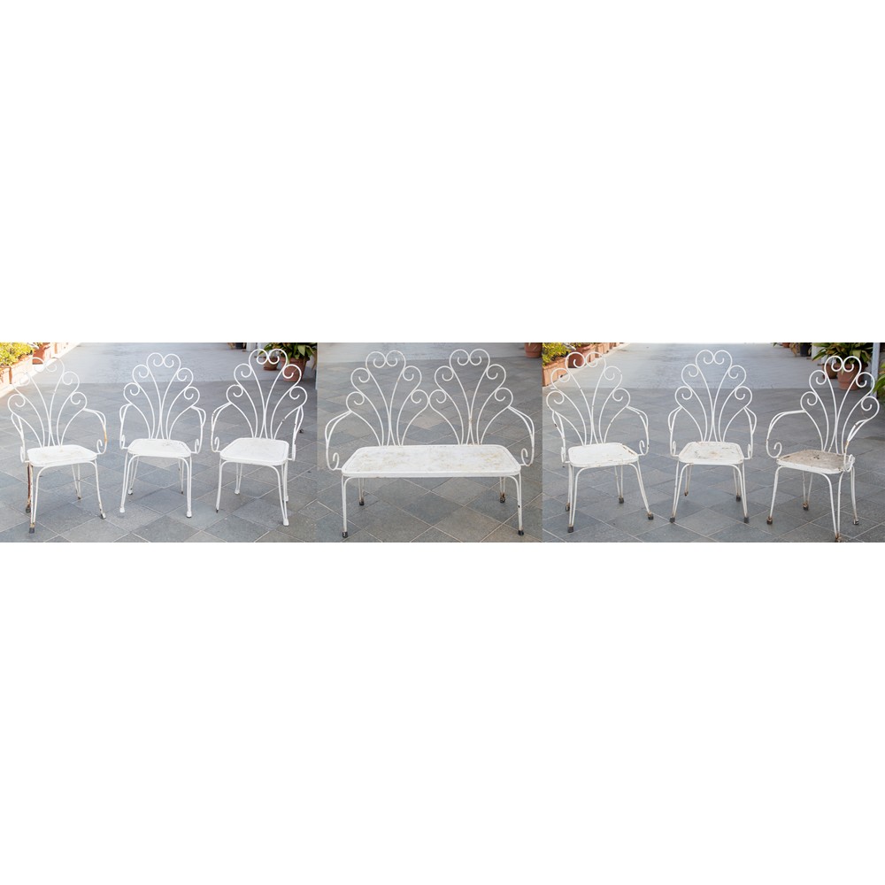 SALOTTO in ferro laccato bianco, composta da: divano a due posti, sei sedie, tavolo con piano in vetro e due fioriere (usure).