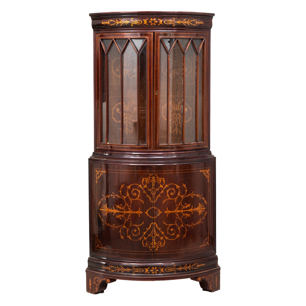 ANGOLIERA ad un'anta e due ante sottostanti in legno di mogano con tarsie in bosso (usure).