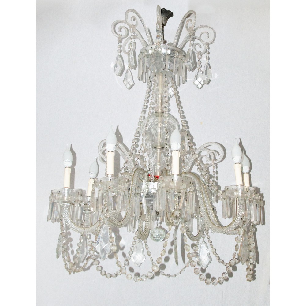 Lampadario a otto luci in cristallo e vetro (scheggiature ed un pendente più piccolo).