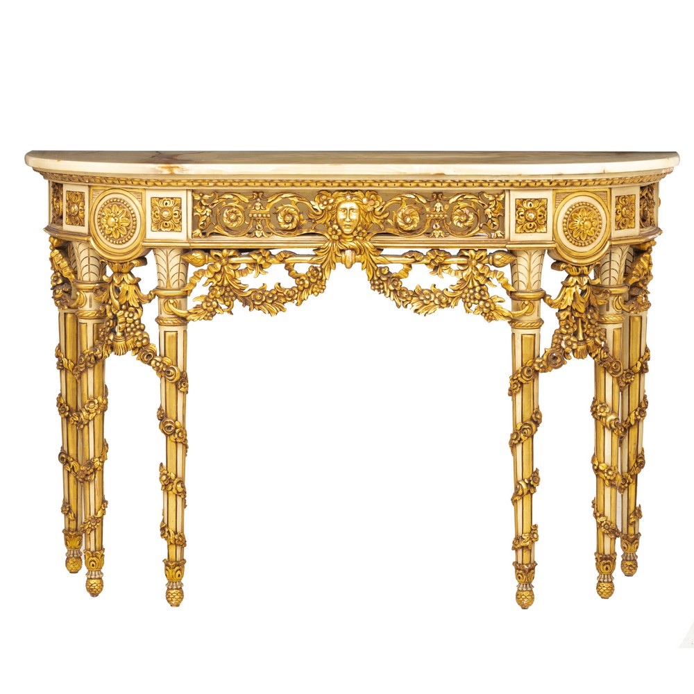 CONSOLLE di gusto eclettico in legno dorato e laccato con piano in onice.