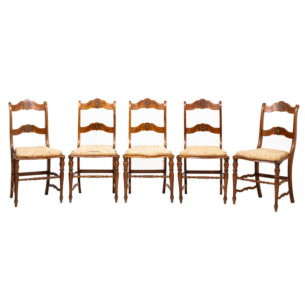 Cinque sedie Carlo X in legno di noce con intarsi in madreperla, palissandro e stagno (usure e rotture).