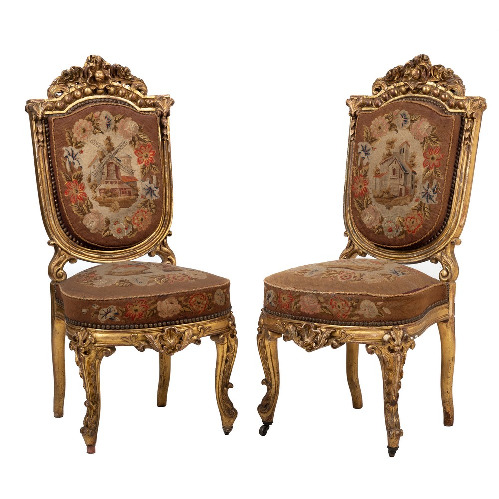 Coppia sedie in legno dorato ad oro zecchino, tappezzeria lavorata a piccolo punto.