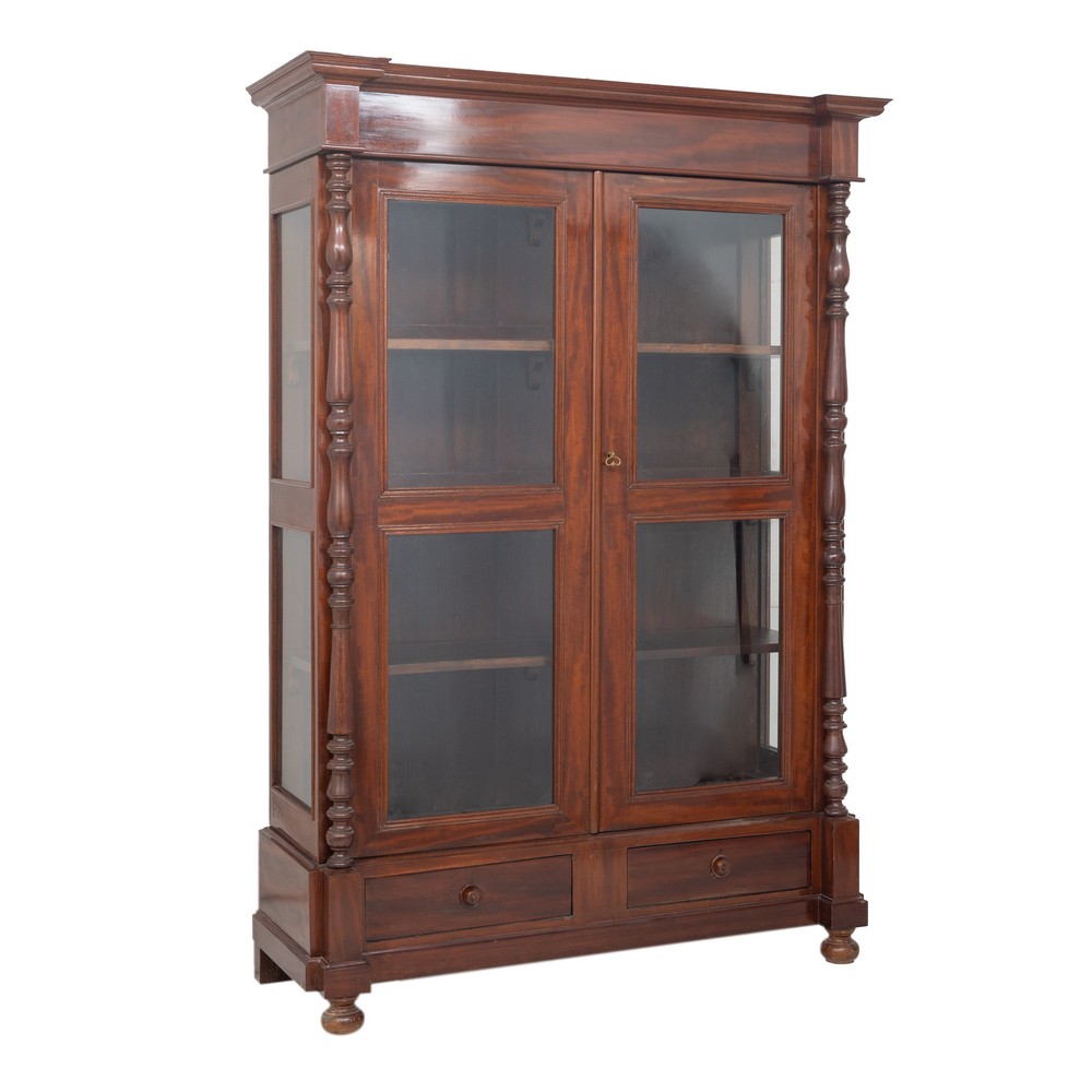 Vetrina in legno di mogano a due ante con due cassetti sottostanti.