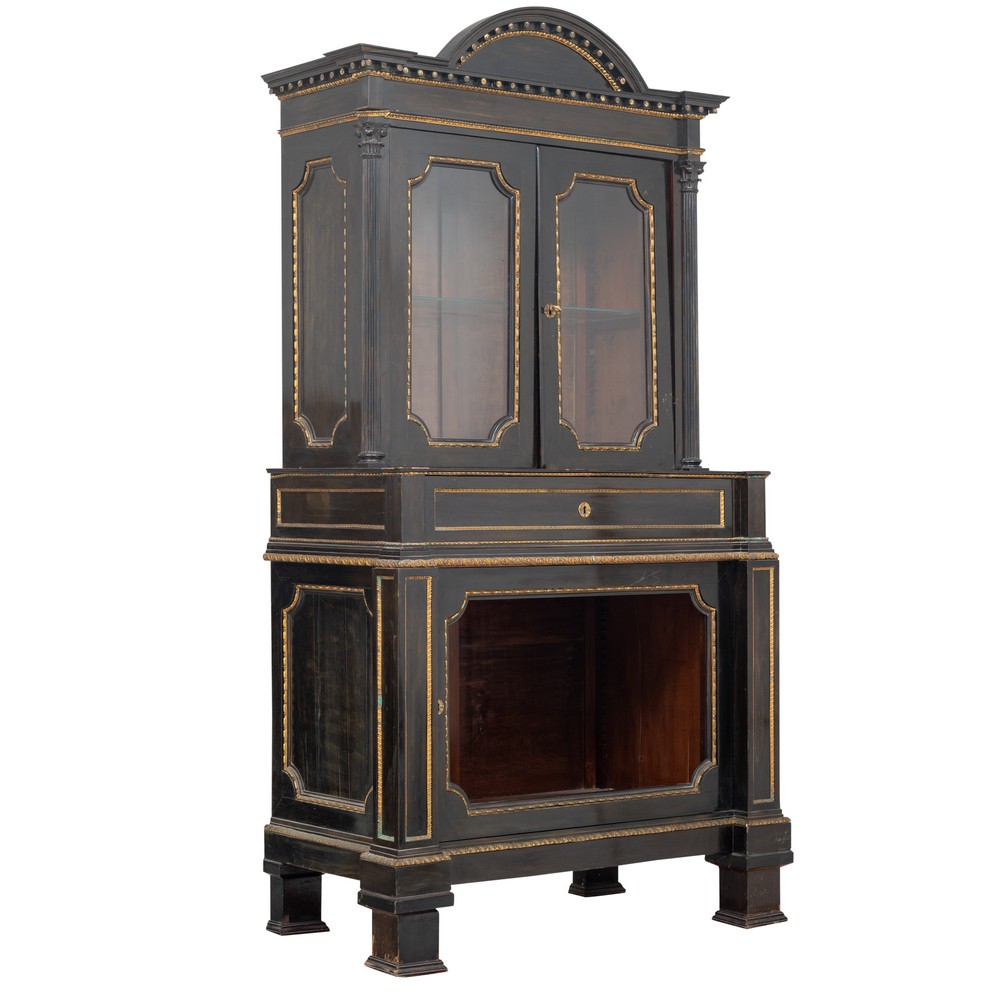 Vetrina Napoleone III doppio corpo in legno ebanizzato con cassetto e guarnitura in bronzo.