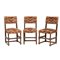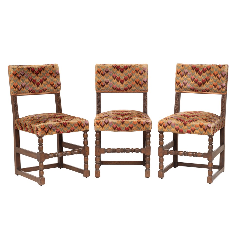Tavolo rettangolare, due poltrone e sei sedie con seduta e spalliera tappezzata in legno di rovere.