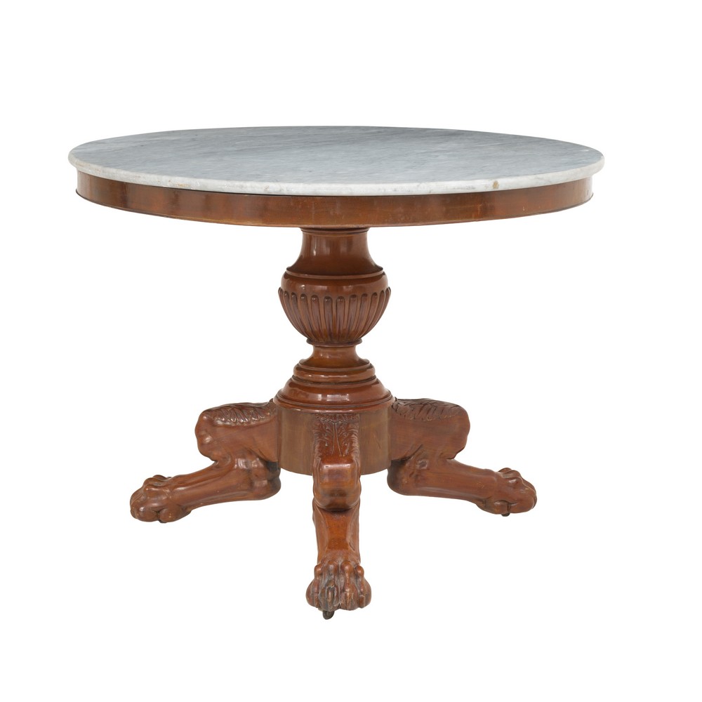 Tavolo da centro Impero in legno di mogano con piede a zampa, piano in marmo bianco di Carrara.