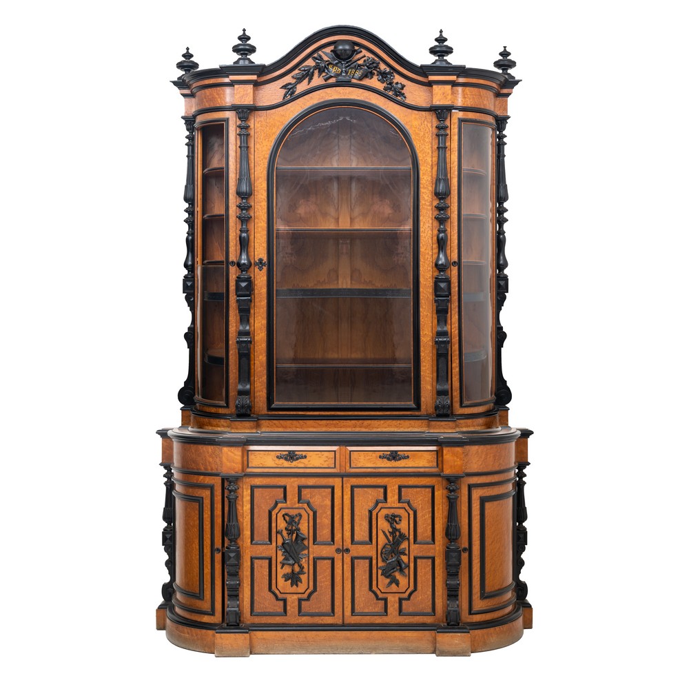 Grande credenza con alzata (doppio corpo) in legno di betulla con elementi in legno ebanizzato a quattro sportelli e due cassetti nella parte inferiore, un'anta in vetro in quella superiore.