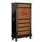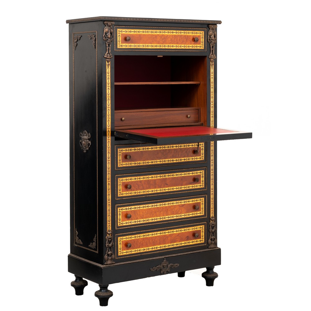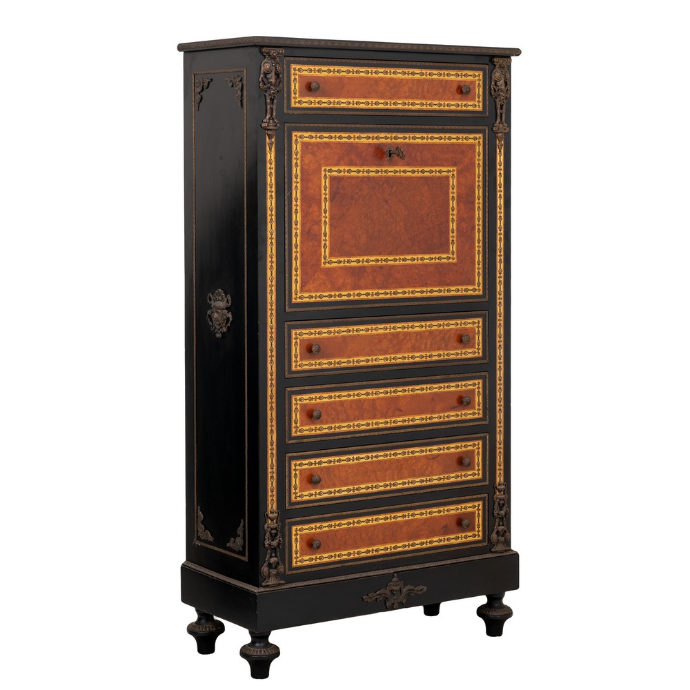 RIBALTINA stile Napoleone III con cinque cassetti in legno ebanizzato, radica di tuja, tarsie in rame e fregi in bronzo.