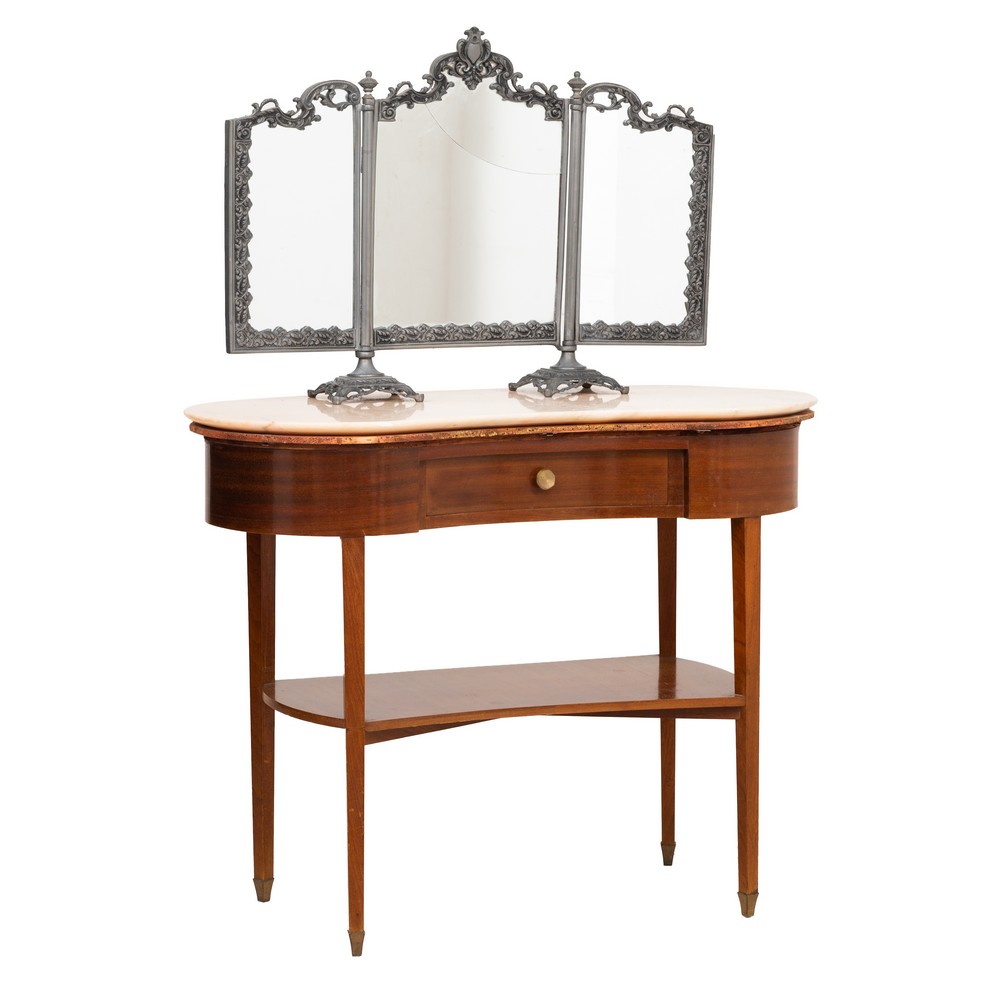 TOLETTINA a fagiolo in legno di noce con piano in onice e specchio in peltro.