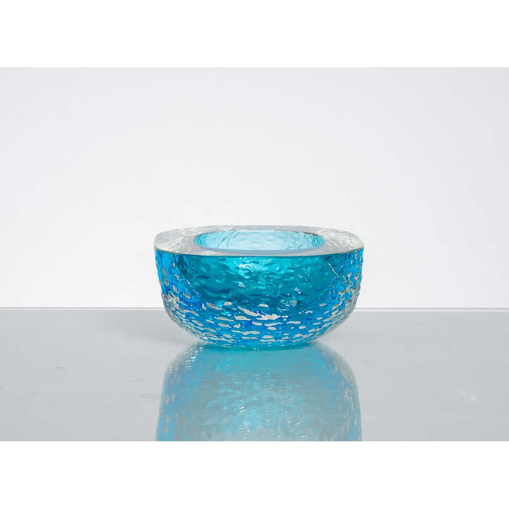 Svuotatasche in vetro corrugato trasparente e blu, corpo a coppa semicircolare.