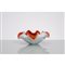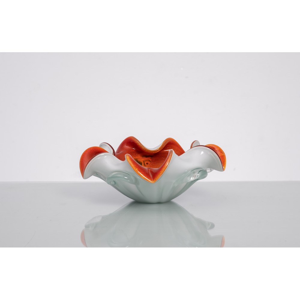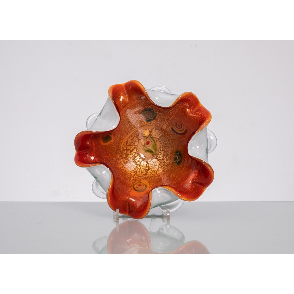 Svuotatasche in vetro incamiciato lattimo e arancione, decorato con murrine e inclusioni oro, corpo a fiore con bordi ondulati.