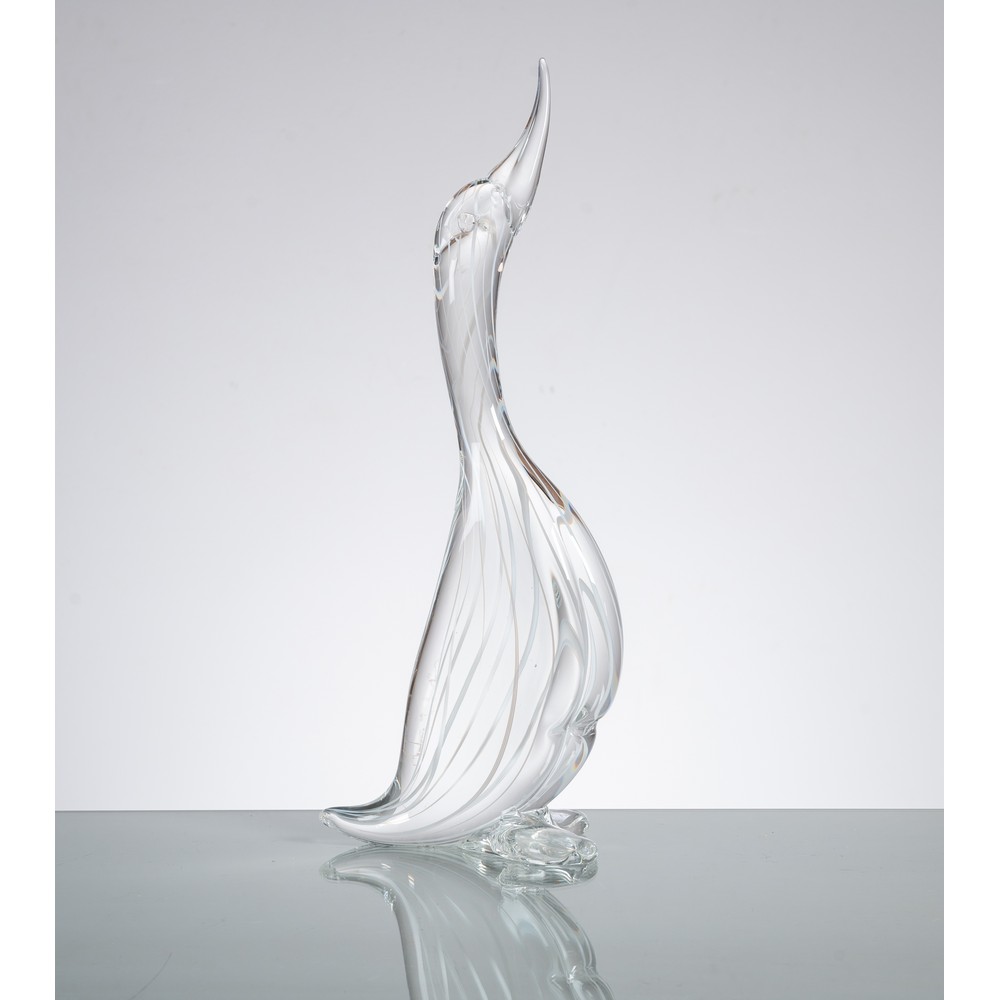 Scultura raffigurante un volatile in vetro incolore con murrine bianche (piccola sbeccatura sotto alla basse).